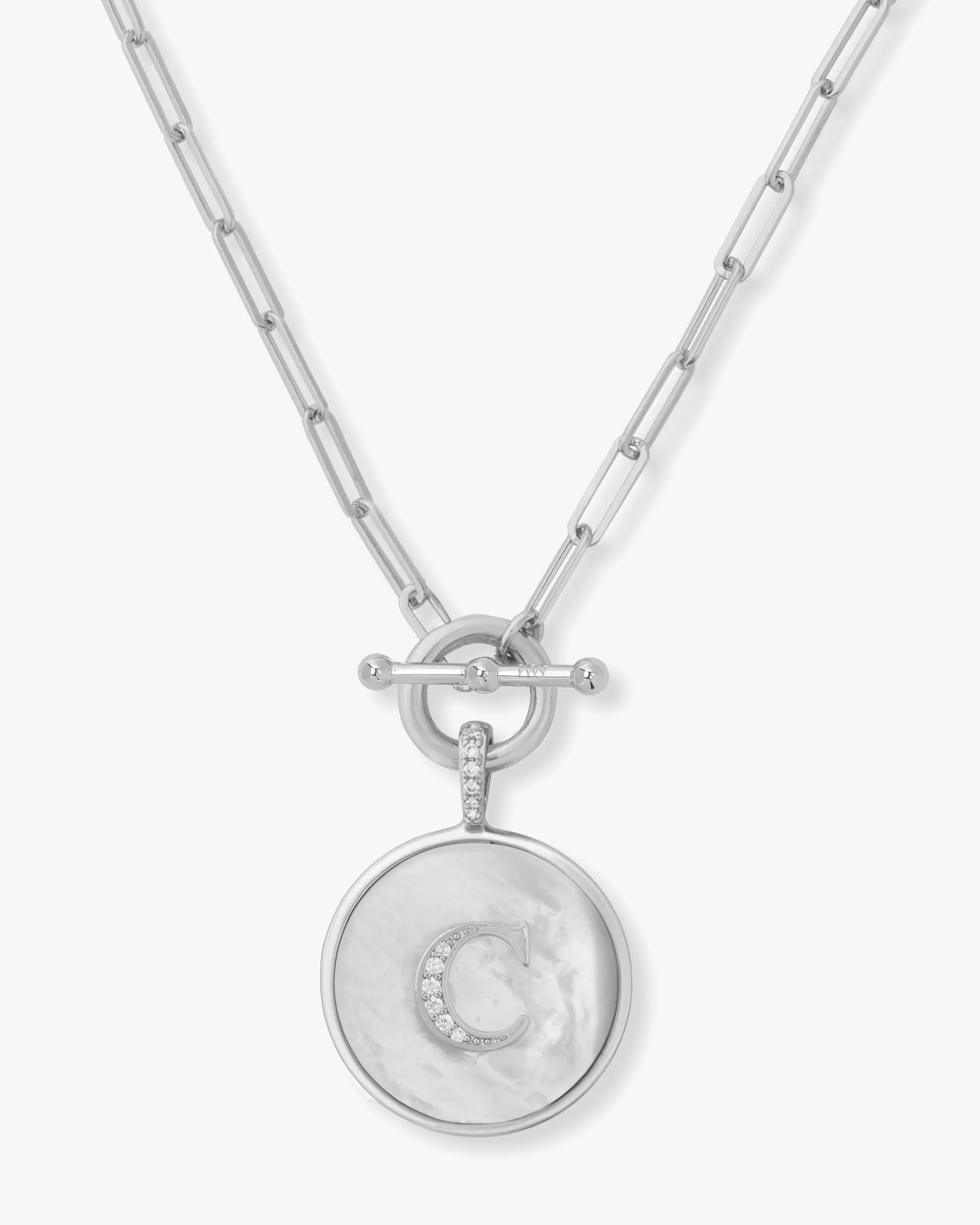 Wear your initial as a modern statement. The Love Letters Medallion Necklace, now in a sleek, luxury silver-plated finish, is the ultimate personal accessory. This 24mm bold medallion is designed for everyday wear, featuring a stunning mix of luminous Mother of Pearl and glittering pavé simulated diamonds. It's an elegant and trendy piece that shines solo or layered. As a signature design from our beloved Love Letters collection, it's a timeless way to tell your story. Explore our complete handcrafted necklace assortment for more inspiration.